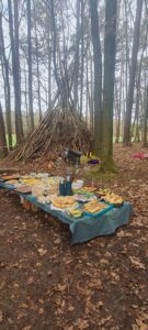 Danach, und das war der spannendste Teil, durften die Kinder im Fichtendickicht nach ihren Osternestern, die sie extra dafür gebastelt hatten, suchen. In der Zwischenzeit richteten die Eltern und Pädagogen, die nicht bei der Suche dabei waren, auf einem vorbereiteten Tisch am Tipiplatz ein großes Osterbuffet aus zahlreichen selbstgemachten süßen und salzigen Leckereien her.